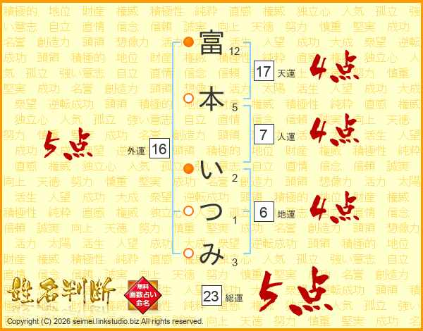 富(12画)本(5画) い(2画)つ(1画)み(3画)