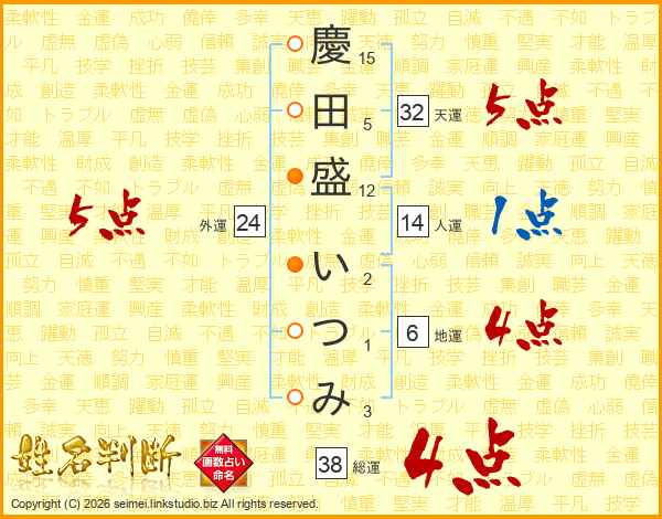 慶(15画)田(5画)盛(12画) い(2画)つ(1画)み(3画)