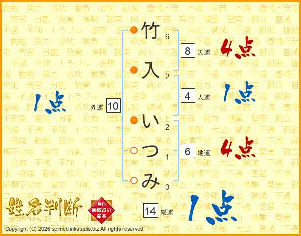 竹(6画)入(2画) い(2画)つ(1画)み(3画)