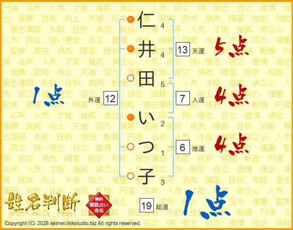 仁(4画)井(4画)田(5画) い(2画)つ(1画)子(3画)