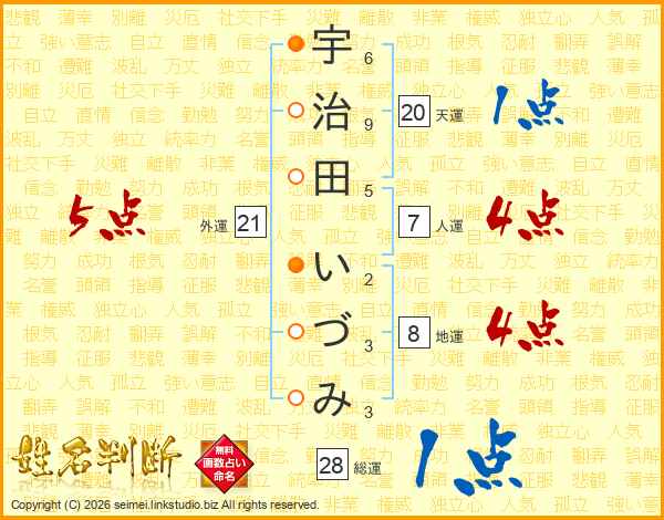 宇(6画)治(9画)田(5画) い(2画)づ(3画)み(3画)