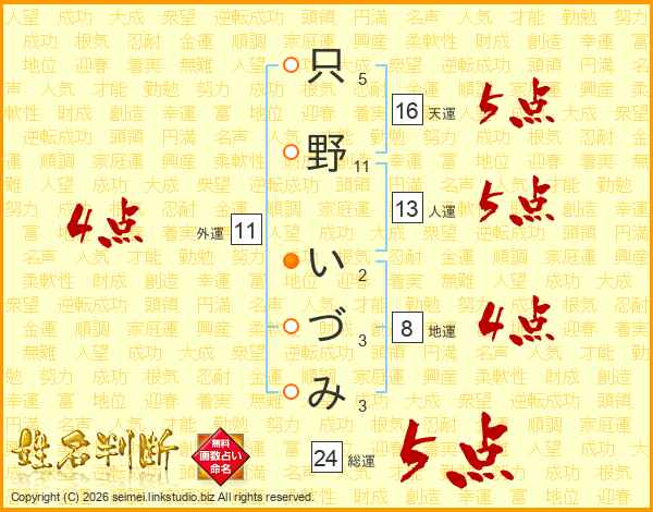 生活面を象徴する運勢です。外部から受ける影響力を表し、結婚運、家庭運や職場、環境への順応性を表します。総運から人運を引いた画数。姓や名が1文字の場合を除く。