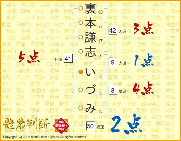 裏(13画)本(5画)謙(17画)志(7画) い(2画)づ(3画)み(3画)