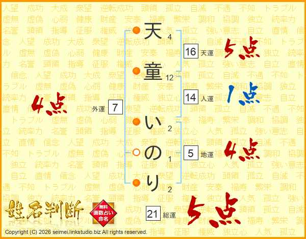 天(4画)童(12画) い(2画)の(1画)り(2画)