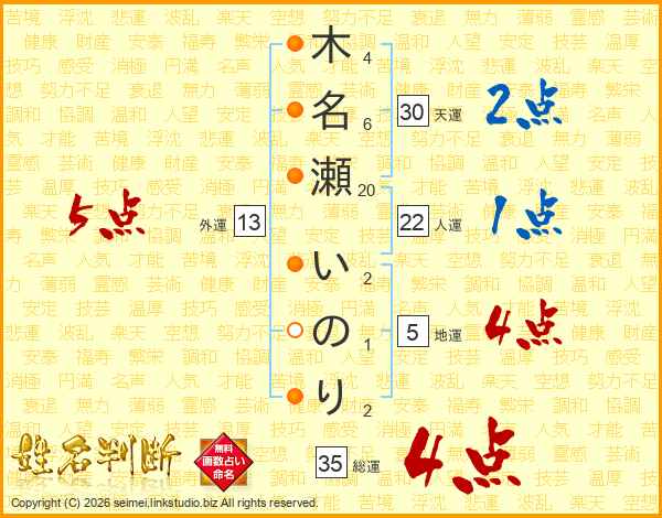 木(4画)名(6画)瀬(20画) い(2画)の(1画)り(2画)
