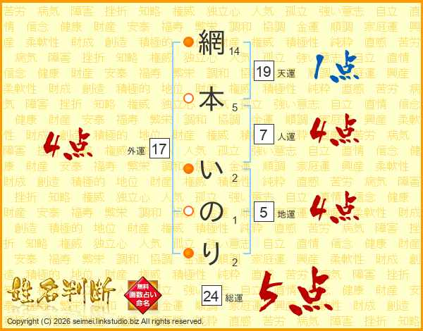 網本いのりさんの天運は19画の1点!