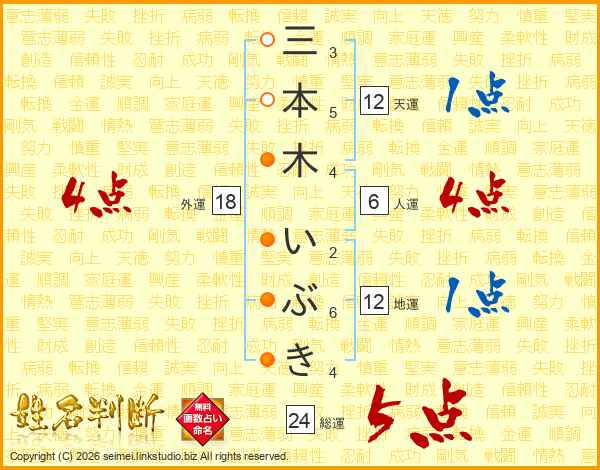 三(3画)本(5画)木(4画) い(2画)ぶ(6画)き(4画)