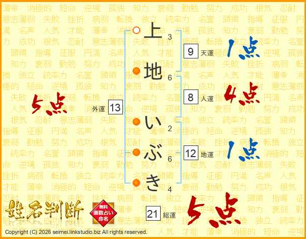 生活面を象徴する運勢です。外部から受ける影響力を表し、結婚運、家庭運や職場、環境への順応性を表します。総運から人運を引いた画数。姓や名が1文字の場合を除く。