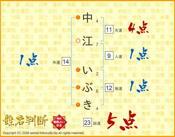 中(4画)江(7画) い(2画)ぶ(6画)き(4画)