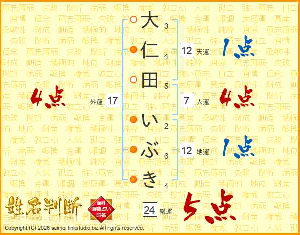 大仁田いぶきさんの総運は24画の5点!