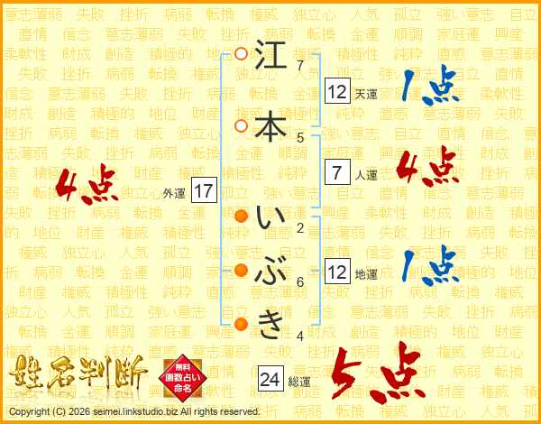 江(7画)本(5画) い(2画)ぶ(6画)き(4画)