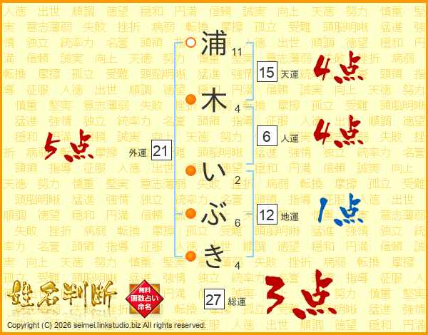 浦木いぶきさんの総運は27画の3点!