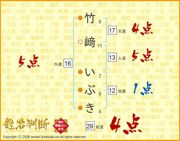 竹(6画)﨑(11画) い(2画)ぶ(6画)き(4画)
