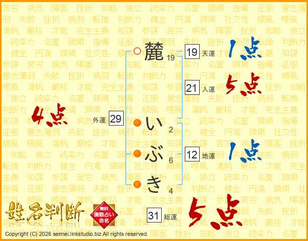 麓(19画) い(2画)ぶ(6画)き(4画)