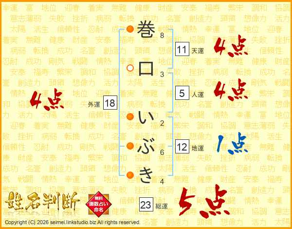 巻(8画)口(3画) い(2画)ぶ(6画)き(4画)