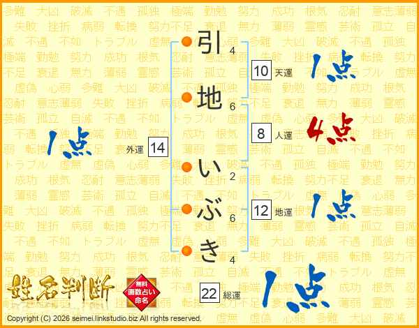 引(4画)地(6画) い(2画)ぶ(6画)き(4画)