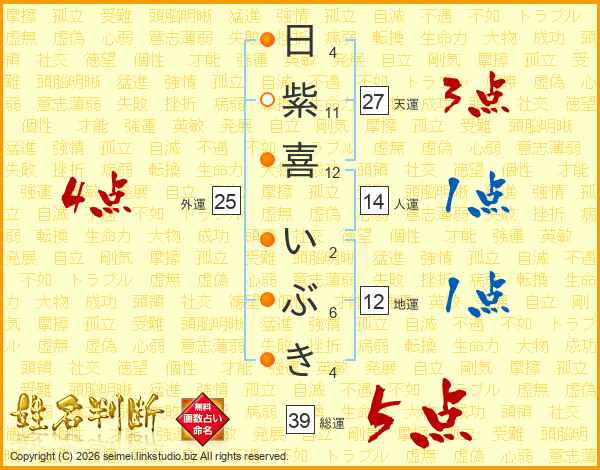日(4画)紫(11画)喜(12画) い(2画)ぶ(6画)き(4画)