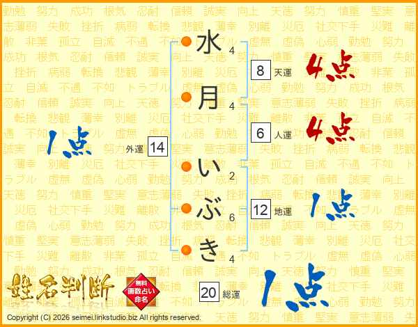 水(4画)月(4画) い(2画)ぶ(6画)き(4画)