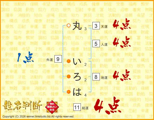 生活面を象徴する運勢です。外部から受ける影響力を表し、結婚運、家庭運や職場、環境への順応性を表します。総運から人運を引いた画数。姓や名が1文字の場合を除く。