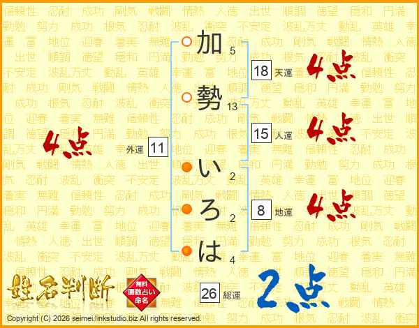 加勢いろはさんの総運は26画の2点!