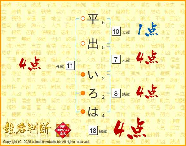 平(5画)出(5画) い(2画)ろ(2画)は(4画)