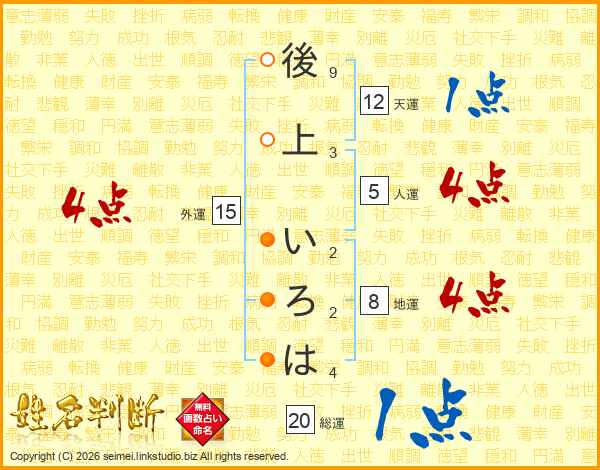 生活面を象徴する運勢です。外部から受ける影響力を表し、結婚運、家庭運や職場、環境への順応性を表します。総運から人運を引いた画数。姓や名が1文字の場合を除く。