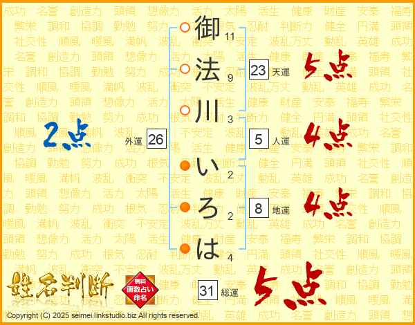 御(11画)法(9画)川(3画) い(2画)ろ(2画)は(4画)