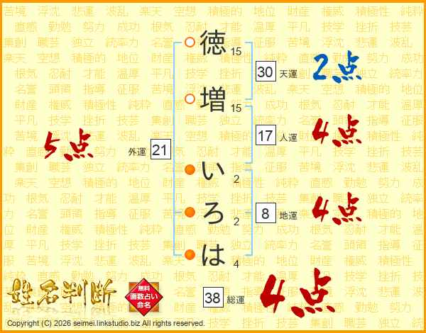徳(15画)増(15画) い(2画)ろ(2画)は(4画)