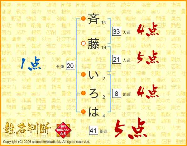 斉藤いろはさんの総運は41画の5点!