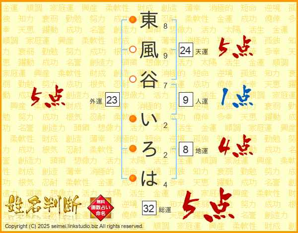 東風谷いろはさんの総運は32画の5点!