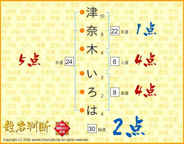 津(10画)奈(8画)木(4画) い(2画)ろ(2画)は(4画)
