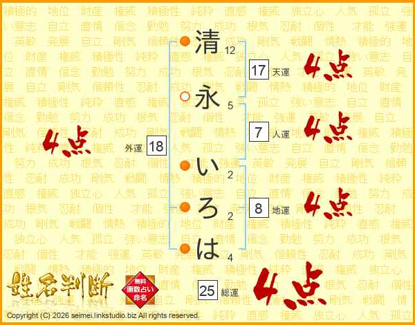 清(12画)永(5画) い(2画)ろ(2画)は(4画)