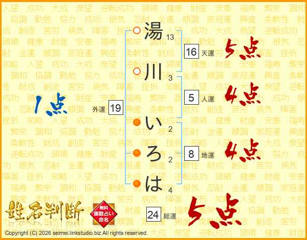 湯(13画)川(3画) い(2画)ろ(2画)は(4画)