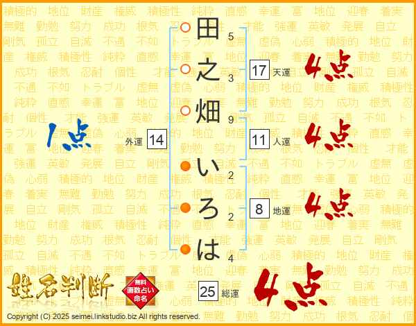 田(5画)之(3画)畑(9画) い(2画)ろ(2画)は(4画)
