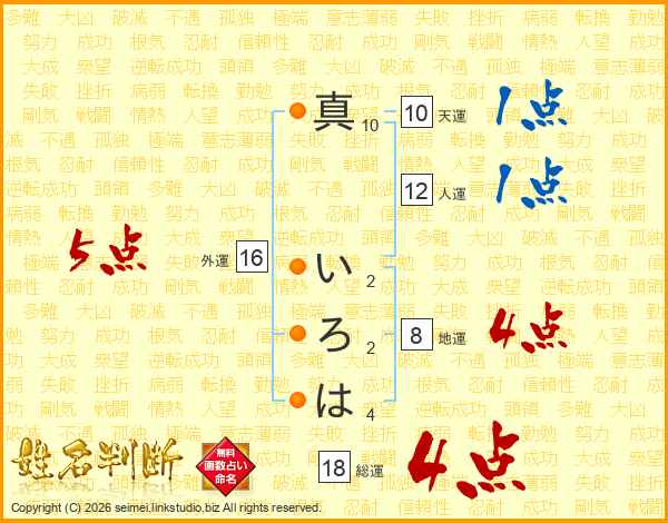あなたの人生を表す1番重要な運勢です。生涯を通じて影響する総合運となり、主に50歳以降の晩年期に影響を及ぼします。苗字と名前の合計画数。