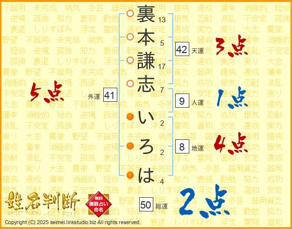 裏(13画)本(5画)謙(17画)志(7画) い(2画)ろ(2画)は(4画)
