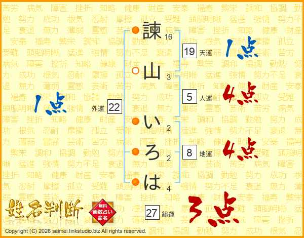 諫(16画)山(3画) い(2画)ろ(2画)は(4画)