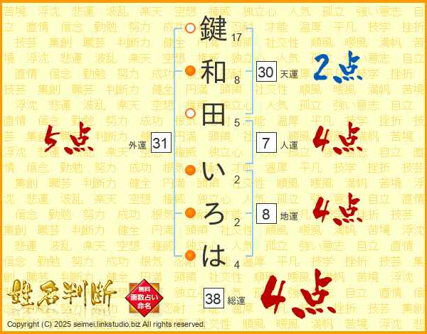 鍵和田いろはさんの総運は38画の4点!