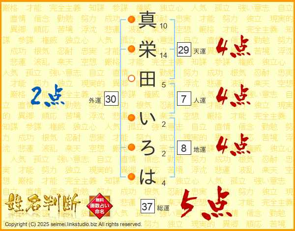 真(10画)栄(14画)田(5画) い(2画)ろ(2画)は(4画)
