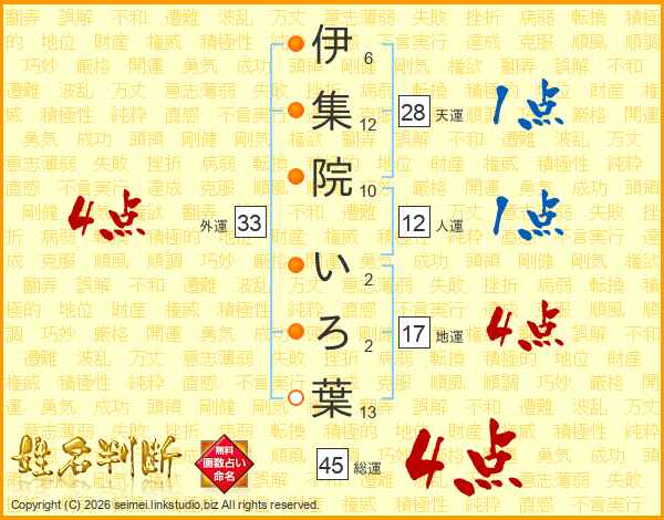 伊(6画)集(12画)院(10画) い(2画)ろ(2画)葉(13画)