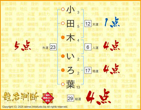 小(3画)田(5画)木(4画) い(2画)ろ(2画)葉(13画)