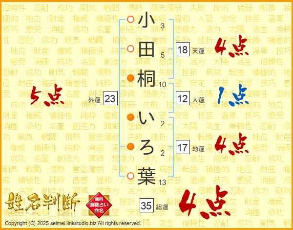 小(3画)田(5画)桐(10画) い(2画)ろ(2画)葉(13画)