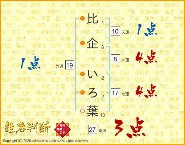 比企いろ葉さんの総運は27画の3点!