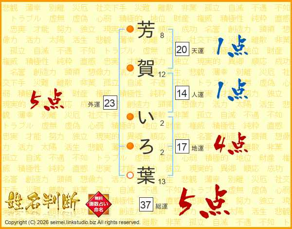 芳(8画)賀(12画) い(2画)ろ(2画)葉(13画)
