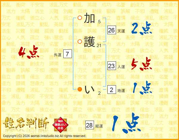 生活面を象徴する運勢です。外部から受ける影響力を表し、結婚運、家庭運や職場、環境への順応性を表します。総運から人運を引いた画数。姓や名が1文字の場合を除く。