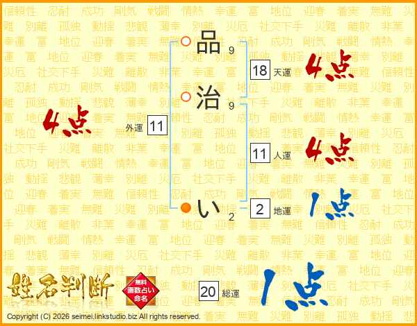 生活面を象徴する運勢です。外部から受ける影響力を表し、結婚運、家庭運や職場、環境への順応性を表します。総運から人運を引いた画数。姓や名が1文字の場合を除く。