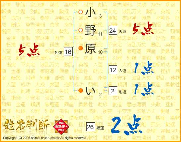 生活面を象徴する運勢です。外部から受ける影響力を表し、結婚運、家庭運や職場、環境への順応性を表します。総運から人運を引いた画数。姓や名が1文字の場合を除く。