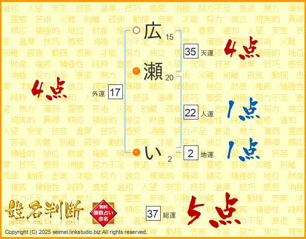 生活面を象徴する運勢です。外部から受ける影響力を表し、結婚運、家庭運や職場、環境への順応性を表します。総運から人運を引いた画数。姓や名が1文字の場合を除く。