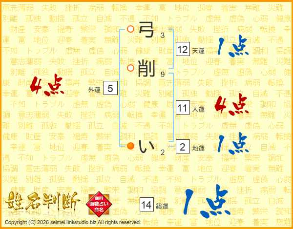 生活面を象徴する運勢です。外部から受ける影響力を表し、結婚運、家庭運や職場、環境への順応性を表します。総運から人運を引いた画数。姓や名が1文字の場合を除く。
