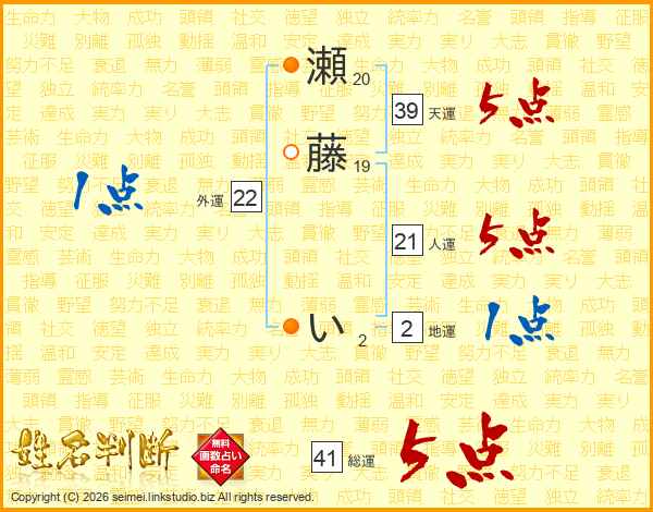 生活面を象徴する運勢です。外部から受ける影響力を表し、結婚運、家庭運や職場、環境への順応性を表します。総運から人運を引いた画数。姓や名が1文字の場合を除く。